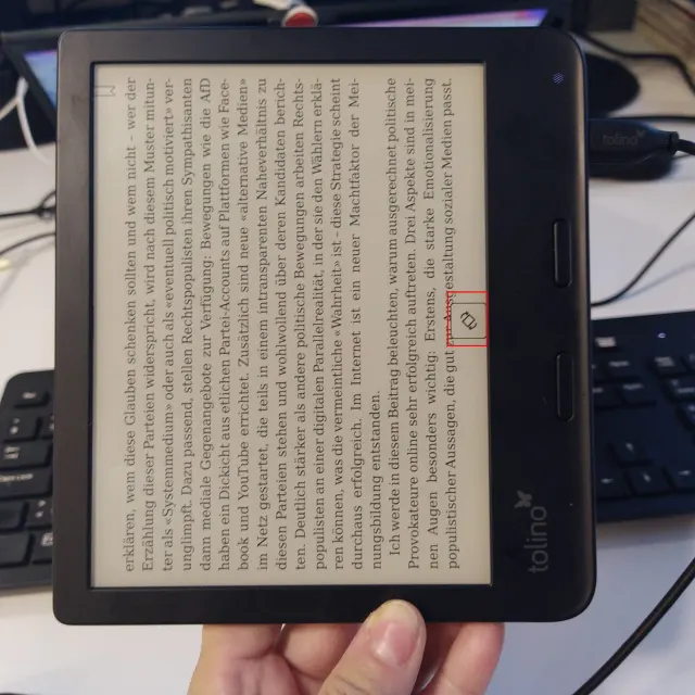 Zwar blieb das Format gleich, aber die Display-Generation wurde ausgetauscht. Der Hersteller spricht von einer 20 Prozent kürzeren Reaktionszeit des E-Ink-Displays. Es bietet eine HD-Auflösung (1264 × 1680 Bildpunkten, 300 ppi) mit 16 Graustufen und sowohl Hoch- als auch Querformat. Ausserdem gibts die automatische Display-Rotation. Damit können Sie flexibel entweder im Hoch- und Querformat lesen. Wer Auto-Flip nicht mag: Beim Testgerät, das dem PCtipp zur Verfügung gestellt wurde, erkennt der Vision 6 zwar sofort, dass die Autorin das Gerät dreht, der Inhalt wird aber nicht automatisch gedreht. Stattdessen wird ein Dreh-Symbol angezeigt, über das man manuell den Inhalt an z.B. das Querformat anpassen kann. So wird versehentliches Drehen verhindert.