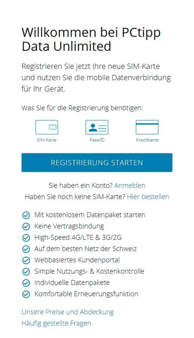 Quelle: PCtipp.chNun sind Sie schon fast fertig. Jetzt müssen Sie noch die neue SIM-Karte aktivieren. Besuchen Sie dazu auf dem Computer oder Smartphone die Internetadresse data.pctipp.ch, Bild 2. Klicken Sie auf Registrierung starten. Während des Registrierungsprozesses werden Sie zur SIM-Nummer und dem Abonnement befragt. Zudem benötigen Sie eine ID oder einen Pass zur Identitätsprüfung. Sobald Sie die Identitätsprüfung erledigt und die persönlichen Angaben ergänzt haben, sind Sie bereit fürs mobile Internet. Setzen Sie die neue SIM-Karte ins gewünschte Gerät ein (die SIM-Karte lässt sich dank variabler Grösse in jedem Gerät nutzen). Das kann z. B. eine Smartwatch, ein Handy, ein Tablet, ein Laptop, eine Überwachungskamera oder ein Router mit SIM-Slot sein.