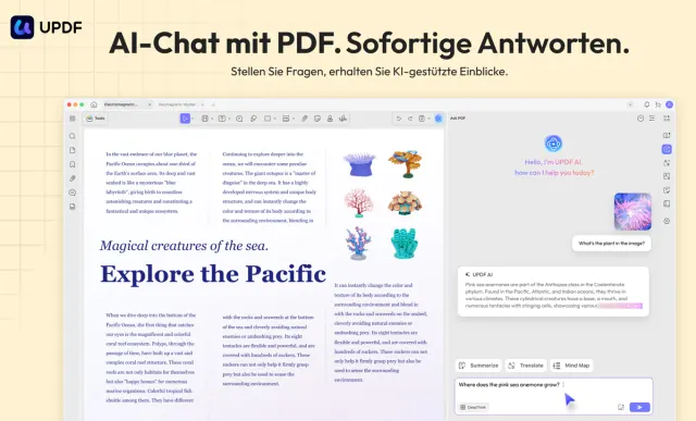 Nutzen Sie fortschrittliche AI-Technologie, um direkt mit Ihren PDF-Dokumenten zu interagieren. Chatten Sie mit Ihren Dateien, stellen Sie kontextbezogene Fragen oder erstellen Sie bei Bedarf prägnante Zusammenfassungen. Übersetzen Sie Inhalte mühelos in andere Sprachen, ohne dabei das ursprüngliche Layout und die Formatierung zu verlieren. Wandeln Sie Dokumente nahtlos in Mind Maps um, um Informationen besser zu visualisieren und Ihre Ideen zu strukturieren - perfekt für die Arbeit in der Forschung, bei der Datenanalyse und bei kreativen Projekten.
