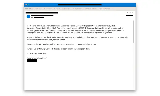 In den meisten Fällen geht es um dringende Zahlungen, die für den angeblichen Freund gemacht werden müssen. Dazu soll der Betroffene beispielsweise iTunes-Karten in einem bestimmten Wert kaufen. Der Code auf der Rückseite der Karte soll dann den Tätern zugestellt werden.