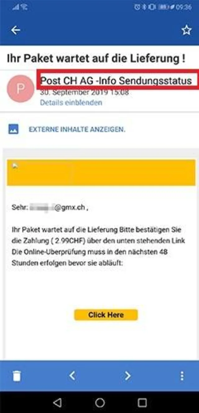 Das Timing war äusserst gut: Die Autorin erwartete tatsächlich ein Päckchen und hatte erst kurz davor eine richtige E-Mail-Benachrichtigung der Post erhalten. Der Absender ist zudem sehr ähnlich benannt wie das Original: Post CH AG -Info Sendungsstatus. Erst wenn man sich die Details anschaut, runzelt man die Stirn: «chansen7883@charter.net» ist sicher nicht die offizielle E-Mail-Adresse der Schweizerischen Post. Korrekt wäre: Post CH AG - Info Sendungsstatus <notifications@post.ch>. Zudem wirkt auch die Anrede nicht seriös: Sehr: xx@gmx.ch.