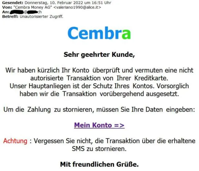 Die E-Mails sind mit Logos der Cembra Money Bank versehen. In der Mitteilung heisst es, dass ein unberechtigter Zugriff auf das Konto erfolgt sei. Dadurch soll die Empfängerin oder der Empfänger dazu gebracht werden, auf einen Link zu klicken, der auf eine gefälschte Webseite führt, schreibt die Kantonspolizei Zürich (KaPo Zürich) auf cybercrimepolice.ch.