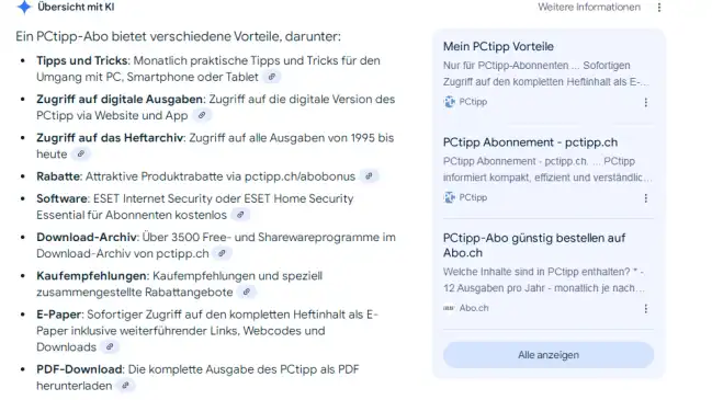 Die Google Suche mit KI-basierten Übersichten ist hierzulande da. Ab sofort ist das Feature «Übersicht mit KI» auch in der Schweiz verfügbar - in Deutsch, Französisch, Italienisch sowie auf Englisch.