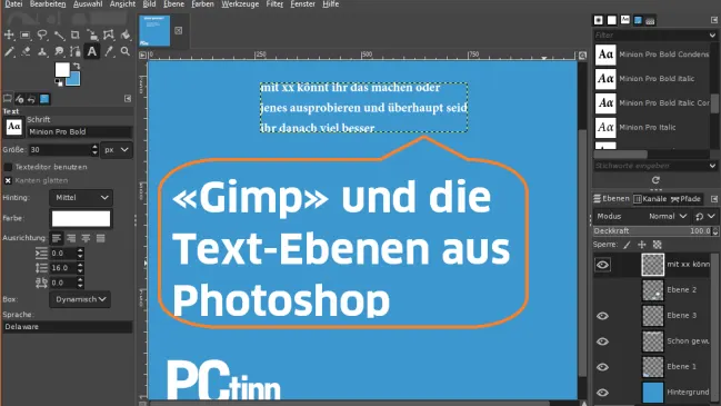 Fast jeder Gimp-User stösst früher oder später auf diese Hürde: Gimp kann Photoshop-Dateien (.psd) zwar mitsamt den Ebenen importieren. Aber bei Textebenen müssen Sie tricksen, denn der Text ist nicht bearbeitbar. Kein Problem, findet die Autorin.
