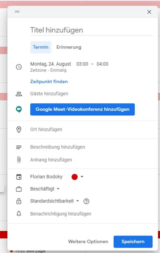 - Buchstabe C: Befinden Sie sich im Google Kalender, drücken Sie einfach nur C. Dann erscheint die Maske zum Erfassen eines neuen Termins.