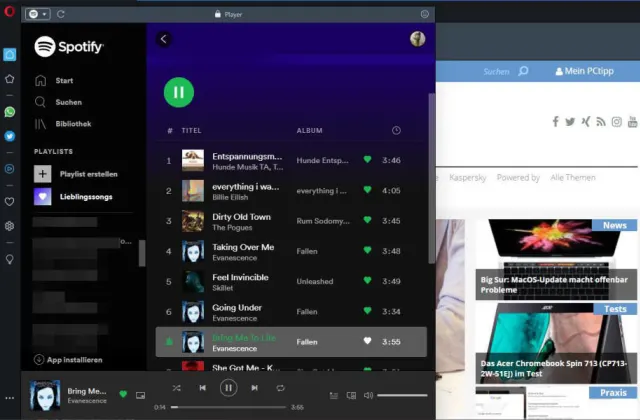 Seit Version 72.0.3815.378 hat Opera einen integrierten Musikplayer (aktuell: 81.0.4196.54). Mit dem integrierten Player geht das Musikhören somit ohne Plugin. Einfach auf das Player-Symbol in der Seitenleiste klicken und sich bei Spotify – oder Apple Music bzw. YouTube Music – anmelden.