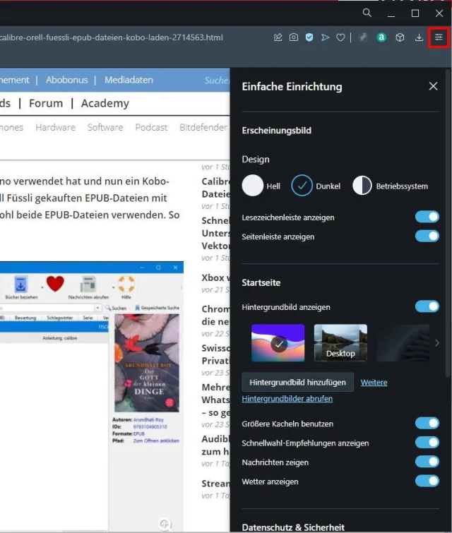 Mit dem Button für «Einfache Einrichtung» können Sie z.B. das Erscheinungsbild, Hintergrundbild, Grösse der Kacheln oder Datenschutzdetails wie VPN oder die Tracker-Blockierung fix anpassen. Wenn Sie den Opera-Browser öffnen, finden Sie oben rechts in der Menüzeile ein Symbol, das an mehrere Schieberegler erinnert. Es handelt sich dabei um die Schaltfläche Einfache Einrichtung.