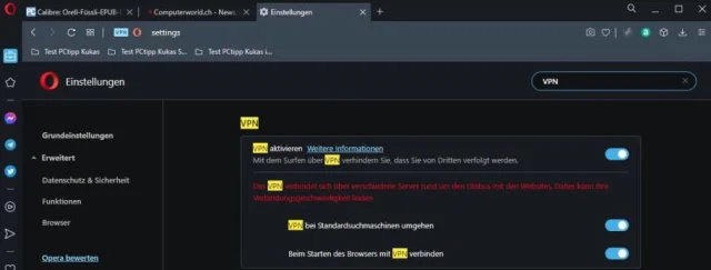 Quelle: Screenshot/PCtipp.chSie haben zwei Auswahlmöglichkeiten: VPN bei Standardsuchmaschinen umgehen (Standardmässig deaktiviert) oder Beim Starten des Browsers mit VPN verbinden (empfohlen, wenn Ihre Surf-Aktivitäten wirklich nicht von Dritten verfolgt werden sollen).