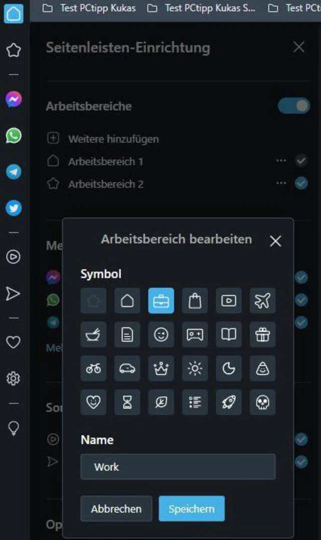 Nun klicken Sie z.B. auf das Koffer-Icon – sagen wir, das wird Ihr Arbeitsbereich. Durch Rechtsklick auf das Icon und anschliessend Arbeitsbereich 1 bearbeiten öffnet sich ein weiteres Fenster. Sie können erst einmal das Symbol nach Wunsch auswählen und den Namen ändern. Klicken Sie auf Speichern.
