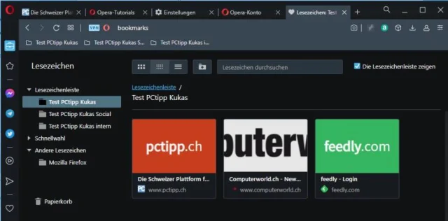 Wer lieber mit Lesezeichen arbeitet, findet sie auch bei Opera. Wenn Sie eine Webseite angesurft haben, die Sie regelmässig besuchen möchten, klicken Sie einfach rechts der Suchleiste auf das Herzchen-Symbol, um die URL Ihren Lesezeichen hinzuzufügen.Klicken Sie anschliessend in der linken Spalte auf das Herzli-Symbol, um den Lesezeichen-Bereich zu öffnen und Ihre Lesezeichen zu bearbeiten.