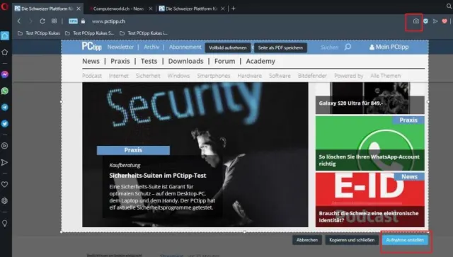 Um einen Screenshot zu erstellen, brauchen Sie kein separates Tool wie Snipping Tool. Sie können dies direkt in Opera erledigen. Hierzu klicken Sie einfach im rechten Bereich des Suchfeldes auf das Kamera-Symbol. Ziehen Sie mit der Maus den rechteckigen Bereich, den Sie fotografieren möchten. Anschliessend klicken Sie auf Aufnahme erstellen.