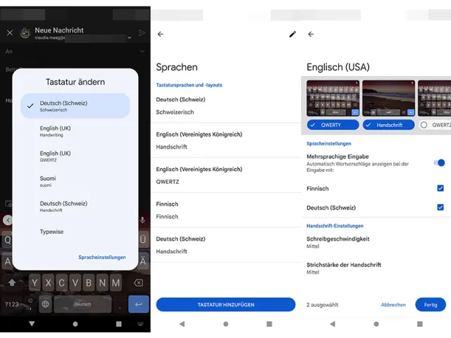 Über die Einstellungen der Smartphone-Tastatur können Sie weitere Tastatur-Sprachen hinzufügen. Es gibt zudem die Möglichkeit, zwischen dem Layout QWERTZ oder QWERTY etc. auszuwählen und auch Handschrift ist eine Option. Handschriftliche Notizen werden direkt in der Gboard-Tastatur eingegeben.- Am bequemsten gelangen Sie zu den Sprachen, indem Sie lange auf die Leertaste drücken.