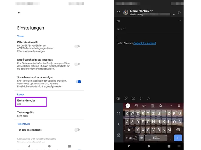 Smartphones wurden in den vergangenen Jahren immer grösser. Ich weiss nicht, wie es Ihnen geht, aber viele sind für meine kleinen Hände sehr gross geraten. Falls es Ihnen ähnlich geht und Sie deshalb zweihändig tippen – was normalerweise, während man auf den Bus wartet, etwas mühsam ist – Gboard bietet einen Einhand-Modus. Sie finden diesen via Zahnrad-Symbol, Einstellungen und unter Layout/Einhandmodus. Sie können wählen, ob Sie die Tastatur links oder rechts angepinnt haben möchten.