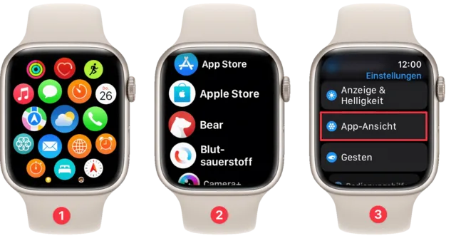 Die App-Übersicht mit den vielen Kreisen und Symbolen ist nicht nach jedermanns Geschmack, (1) denn die Orientierung wird dadurch nicht einfacher. Wenn Sie die Apps in einer alphabetisch sortierten Liste sehen möchten, (2) rufen Sie in den Einstellungen den Bereich App-Ansicht auf (3). Hier wählen Sie zwischen der Raster- und der Listendarstellung.