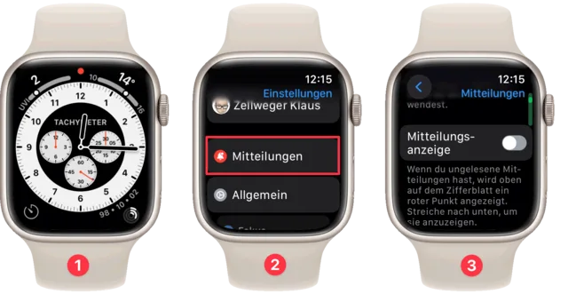 Wenn eine Mitteilung eingeht und verpasst wird, signalisiert das die Apple Watch mit einem roten Punkt, oben in der Mitte. (1) Ich selbst mag ihn nicht, denn wenn die Mitteilung einmal ignoriert wird, brauche ich auch später keine Erinnerung mehr – jedenfalls nicht mehr auf der Apple Watch. Zum Glück lässt sich dieser Fremdkörper auf dem Zifferblatt entfernen, indem in der Einstellung Mitteilungen (2) die Option Mitteilungsanzeige ausgeschaltet wird. (3)
