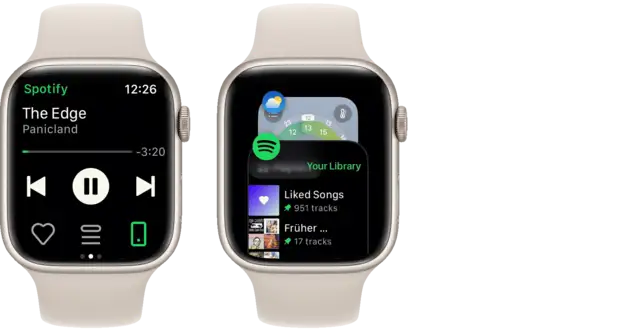 Wenn in einer Musik-App wie Spotify am iPhone die Wiedergabe gestartet wird, erscheinen auf der Apple-Watch automatisch die Bedienelemente, während die Lautstärke durch das Drehen der Krone geregelt wird. Wenn Sie zum Zifferblatt zurückkehren, aktivieren Sie danach die Musiksteuerung erneut, indem Sie die Krone zweimal drücken, um die zuletzt verwendeten Apps zu sehen. Hier wählen die Musiksteuerung aus.Denn leider ist es unter watchOS 10 nicht mehr möglich, die zuletzt verwendete App mit einem einmaligen Drücken auf die Krone aufzurufen. Nervtötend, aber im Augenblick nicht zu ändern.