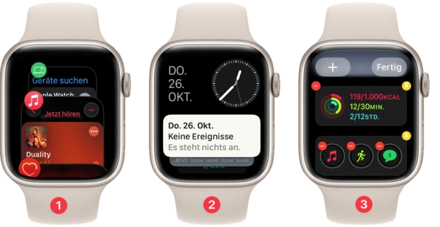 Das Dock zeigt eine Liste der zuletzt geöffneten Apps, die mithilfe der Krone durchgeblättert wird. Dazu drücken Sie schnell zweimal die digitale Krone (1).Doch es gibt eine Alternative: die Favoriten. Dazu drehen Sie einfach ein wenig an der Krone, während das Zifferblatt sichtbar ist. (2) Doch welche Apps werden in welcher Reihenfolge angezeigt? Das bestimmen Sie selbst. Halten Sie den Finger etwas länger auf eine App gedrückt, um in den Editiermodus zu wechseln. Jetzt lassen sich die Apps entfernen oder andere Vertreter durch ein Tippen auf das Pluszeichen hinzufügen. (3)