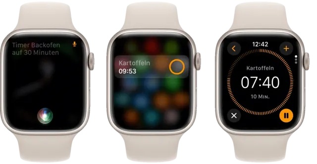 Mit der Apple Watch lassen sich mehrere Timer anlegen. Öffnen Sie dazu die App Timer. Wählen Sie eine vorgegebene Zeitspanne oder tippen Sie auf Eigener, um einen neuen Timer zu erstellen. Wiederholen Sie die Prozedur so oft Sie wollen. Wenn der Timer über Siri gestellt wird, lässt er sich auch benennen: «Hey Siri, Timer ‹Kartoffeln› auf 10 Minuten.»