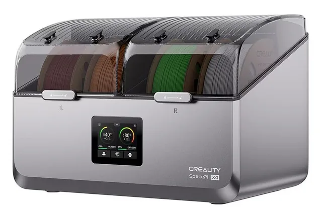 Obwohl PLA zu den pflegeleichtesten Filamenten überhaupt gehört, kann es beim Drucken zu Problemen oder Qualitätseinbussen kommen, wenn es durch die Lagerung Feuchtigkeit aus der Luft aufnimmt. Idealerweise wird es vakuumiert gelagert. Trotzdem gehört ein Filament-Trockner in jede Druckwerkstatt: Diese Geräte arbeiten wie bessere Dörrautomaten und sorgen dafür, dass das Material nach etwa sechs bis acht Stunden wirklich trocken ist. Zu den typischen Vertretern gehört der Space Dryer X4 von Creality, der vier Spulen gleichzeitig aufnimmt, Bild 4. Modelle für nur eine oder zwei Spulen sind auch für unter 50 Franken zu haben.
