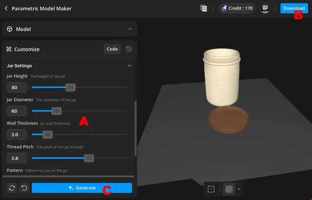Diese Modelle laufen zum Beispiel auf der Website makerworld.com, aber nicht innerhalb der BambuStudio-Software. Um ein Modell zu modifizieren, reicht ein Klick auf die Schaltfläche Anpassen. Danach werden die Werte geändert. Mit einem Klick auf Generate entsteht das neue Modell C.