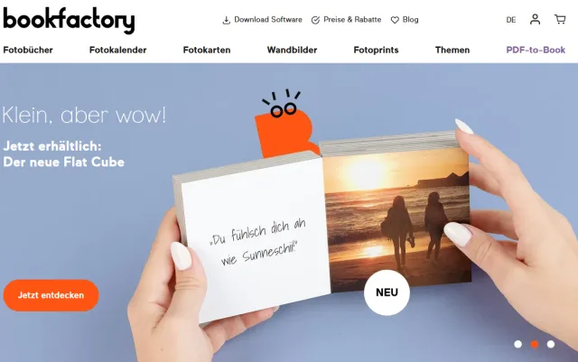 Bookfactory zählt zu den Schweizer Pionieren der Fotobuchszene und ist ein echter Spezialist. Der Anbieter besticht durch seine grosse Auswahl, vielfältigen Gestaltungsmöglichkeiten und seine einfach zu bedienende Fotobuch-Software. Zu den Besonderheiten zählen die hochwertigen, exquisiten Einbände wie Japanseide, Echtleder oder Reptilimitat sowie individuelle Prägungsmöglichkeiten. Weitere Highlights sind die clevere KI-Fotooptimierung, die edle Buchqualität sowie die kurze Versandzeit.