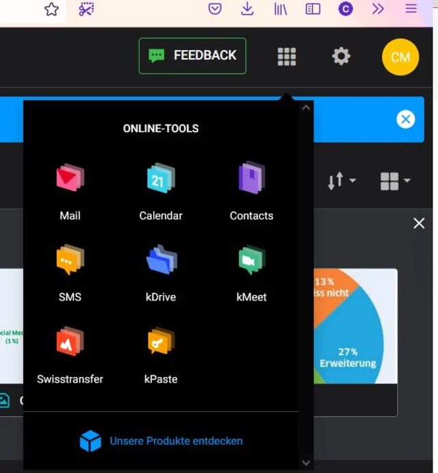 Quelle: Screenshot/PCtipp.chGehen Sie auf die Login-Webseite von Infomaniak und loggen sich ein. Falls automatisch die E-Mail-Ansicht erscheint: Im Menü oben rechts finden Sie die weiteren Infomaniak-Dienste, darunter kDrive.