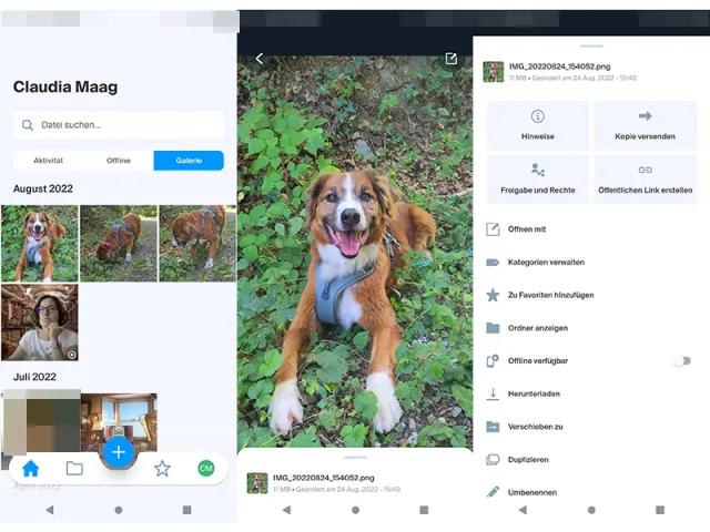Tippen Sie in der Grundansicht der App (Android) auf die Registerkarte Galerie. Wählen Sie ein Bild aus. Schieben Sie den weissen Bereich nach oben, um weitere Funktionen zu sehen. Nun können Sie entweder eine Kopie des Bildes schicken, das Bild freigeben, einen öffentlichen Link erstellen, es verschieben, umbenennen. Oder per Schieberegler Offline verfügbar machen.