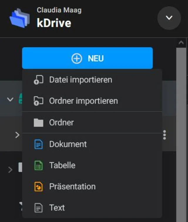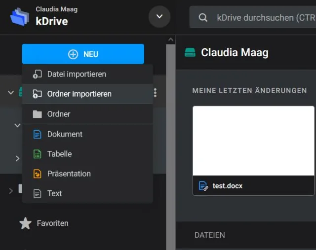 Quelle: Screenshot/PCtipp.chIn der linken Menüspalte finden Sie Ihren kDrive-Ordner und oberhalb davon einen Neu-Button. Über letzteren werden mehrere Funktionen ausgeführt, darunter Dateien importieren. Klicken Sie auf die Schaltfläche + Neu. Wählen Sie entweder Datei importieren oder Ordner importieren. Importierte Ordner werden anschliessend gleich unter Ihrem kDrive-Ordner angezeigt.