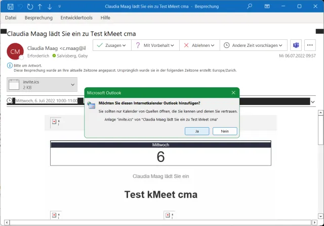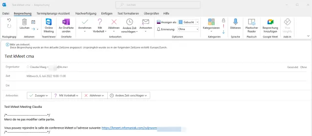 Quelle: Screenshot/PCtipp.chHinweis: Diesmal klappte es mit der Meeting-Einladung an die Redaktionskollegin. Sie konnte die Einladung annehmen. Meetings werden jedoch nicht automatisch zum Outlook-Kalender hinzugefügt, falls die eingeladene Person Ihre Einladungsmail per Outlook empfängt.