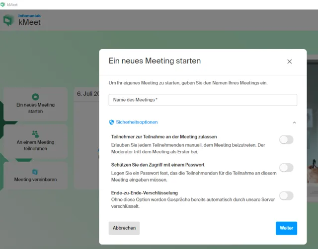 Hinweis: Für Ein neues Meeting starten und An einem Meeting teilnehmen benötigen Sie kein Infomaniak-Konto. Wer allerdings eine Besprechung planen möchte, benötigt ein kostenloses Infomaniak-Konto. Dies, da der Dienst dann mit Ihrem Infomaniak-Kalender verknüpft ist und das Meeting dort direkt eingetragen wird.
