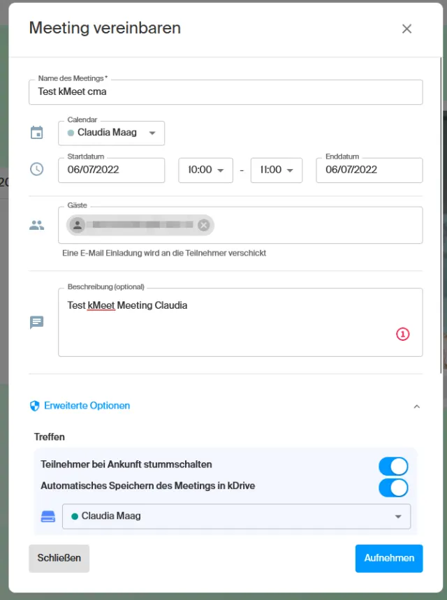 Wählen Sie zudem die Mailadresse eines Gastes. Dadurch wird die andere Person eingeladen. Beschreiben Sie das Meeting, wenn gewünscht.