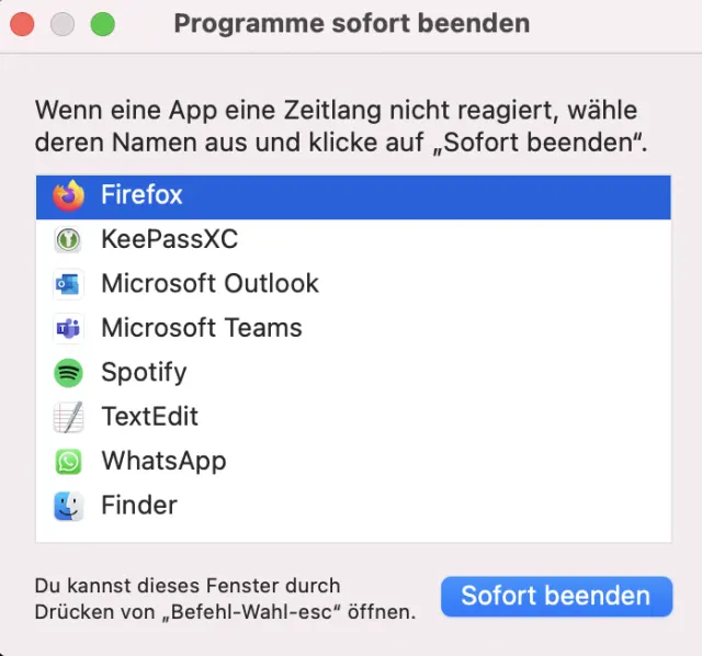Auch unter MacOS gibt es einen Taskmanager. Dies in einer schlankeren und einer umfangreicheren Variante. So werden sie aufgerufen: Command+Option+Esc für den kleinen. Für den grossen gibts leider keinen Shortcut, suchen Sie in der Spotlight-Suche einfach nach Aktivitätsanzeige.