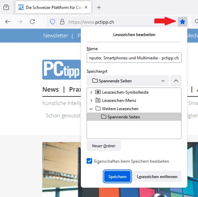 Quelle: PCtipp.chStandardmässig speichert Firefox Ihr neues Lesezeichen im Ordner Weitere Lesezeichen. Klicken Sie rechts daneben auf den nach unten zeigenden Pfeil, um einen anderen Ordner auszuwählen. Durch einen Klick auf Neuer Ordner erzeugen Sie zusätzliche Verzeichnisse. Bestätigen Sie mit Speichern, um das Lesezeichen zu sichern. Später finden Sie es über das Hamburger-Menü sowie Lesezeichen und danach Lesezeichen verwalten wieder.