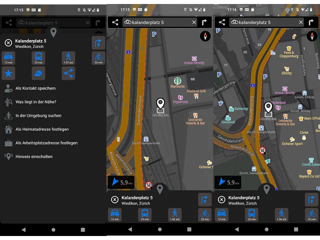 Bei dieser Beispielroute von Dietikon nach Baden sehen Sie links die Routenanweisungen und in der Mitte die Strecke auf der Karte