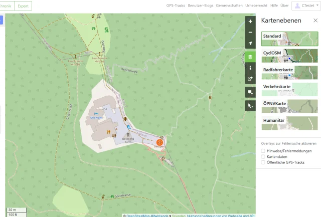 Quelle: Screenshot/PCtipp.chHier finden Sie die Kartenebenen. Zur Verfügung stehen: Standard, CyclOSM, Radfahrerkarte, Verkehrskarte, ÖPNVKarte und Humanitär. Klicken Sie auf das Gewünschte.