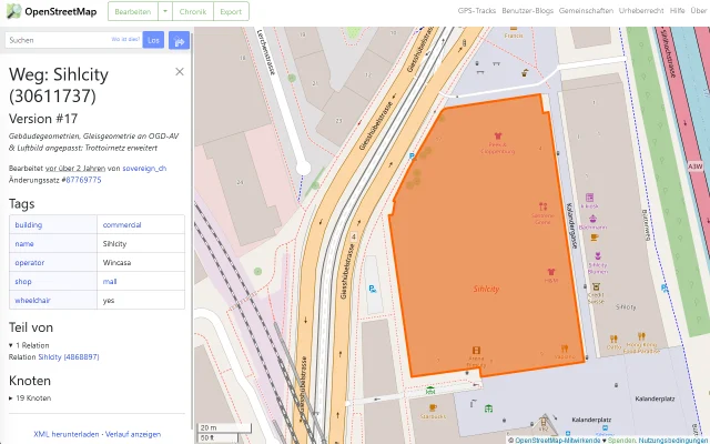 OpenStreetMap-Details für das Einkaufszentrum Sihlcity, Zürich
