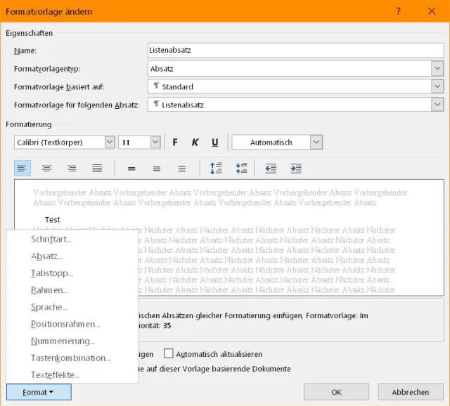 Aufzählungen: Tippen Sie auf einer neuen Word-Zeile einmal einen Bindestrich, ein Leerzeichen und ein Wort ein (z.B. «- Test») und drücken Sie dahinter Enter. Word erstellt eine automatisch formatierte Aufzählung. Soll es dies nicht mehr tun? Wieder gibts einen Abstecher zu Datei/Optionen/Dokumentprüfung. In den AutoKorrektur-Optionen finden Sie unter AutoFormat während der Eingabe die Automatische Aufzählung. Deaktivieren Sie diese.Bei solchen Dingen lohnt es sich aber zu überlegen. Vielleicht wollen Sie es nicht abschalten, sondern an Ihre Wünsche anpassen. Öffnen Sie im Reiter Start übers kleine Steuerelement die Formatvorlagen. Klicken Sie jene namens Listenabsatz an und klicken Sie auf Ändern. Nun lässt sich via Format das Aussehen ändern.