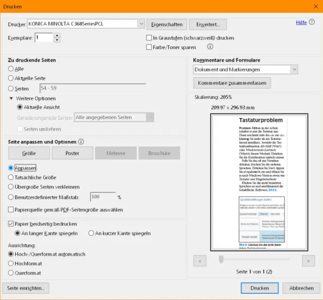 Druckdialog im Adobe Reader; wählen Sie Aktuelle Ansicht sowie Anpassen.