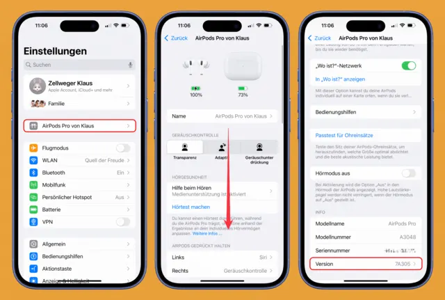 Firmware. Die AirPods Pro 2 benötigen mindestens die Firmware 7A305 oder neuer. Welches die aktuellste Firmware überhaupt ist, erfahren Sie auf dieser Apple Support-Seite. Um die Firmware der AirPods Pro zu prüfen, tragen Sie die AirPods und rufen Sie deren Einstellungen am iPhone auf. Wischen Sie ganz nach unten bis zum Bereich Info: