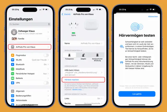 Die AirPods Pro müssen getragen werden, damit die Einstellungen dazu eingeblendet werden, die auch zum Hörtest führen