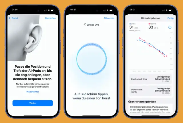 Kaum jemand lässt ohne Anlass einen Hörtest anfertigen. Es liegt wohl in der Natur der Sache, dass wir uns erst um das Gehör kümmern, wenn etwas im Argen liegt. Und so weiss das Gros der Menschen nicht, wie es um die eigene Hörfähigkeit bestellt ist. Doch das klärt sich jetzt, ohne dass ein Termin bei einem Spezialisten vereinbart werden muss.Um an den Hörtest heranzukommen, müssen die AirPods Pro getragen werden – denn erst dann tauchen sie in den Einstellungen des iPhones auf. Tippen Sie im neuen Bereich Hörgesundheit auf Hörtest machen.