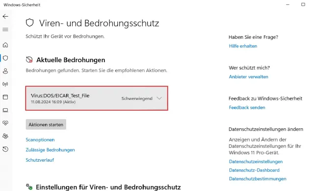 Bild 2: Gefahr droht – hier wurde der (Test-)Virus im Microsoft Defender erwischt