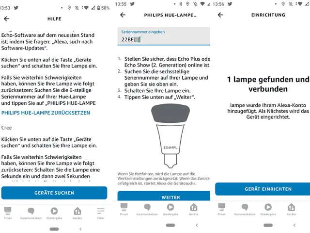 - Zurück in der Alexa-App, tippen Sie nun diese Seriennummer ein. Folgen Sie den Instruktionen der App.