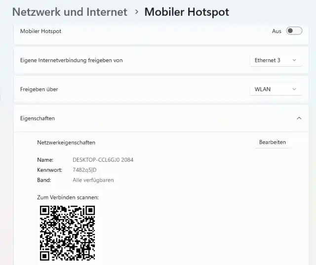 Verbinden Sie den Rechner zunächst mit dem Internet. Nun gehen Sie zu den Windows-Einstellungen, indem Sie die Tastenkombi Windowstaste+I drücken. Jetzt wählen Sie im Einstellungsmenü Netzwerk & Internet aus und klicken dort auf Mobiler Hotspot. Wählen Sie unter Meine Internetverbindung freigeben von die aktive Internetverbindung aus, die Sie freigeben möchten, etwa Ethernet. Greifen Sie unter Freigeben über zur Option WLAN, damit sich andere Geräte drahtlos verbinden können. Unter dem Punkt Bearbeiten weisen Sie optional Ihrem WLAN-Hotspot einen Netzwerknamen (SSID) und ein Passwort zu und speichern die Änderungen. Abschliessend schalten Sie den mobilen Hotspot über den Schalter ein. Über den eingeblendeten QR-Code ist eine schnelle Verbindung möglich, Bild 2.