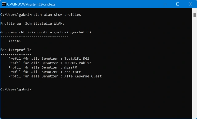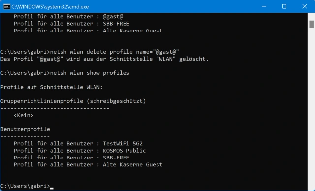 Die Bestätigung erscheint: «Das Profil 'Netzwerkname' wird aus der Schnittstelle 'WLAN' gelöscht». Führen Sie anschliessend netsh wlan show profiles erneut aus, ist das Wi-Fi aus der Liste verschwunden.