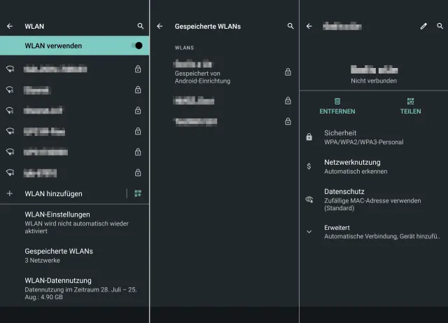 Öffnen Sie die Einstellungen-App und gehen Sie zu Netzwerk & Internet. Tippen Sie auf WLAN. Scrollen Sie herunter, bis Sie zu Gespeicherte WLANs gelangen. Tippen Sie drauf. Die gespeicherten Funknetze erscheinen. Nach einem Tipper auf das zu löschende Netzwerk gelangen Sie in die Detailansicht. Benutzen Sie hier den Button Entfernen.