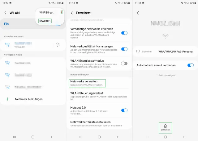 Ganz oben rechts, hinter der Überschrift WLAN, finden Sie ein unscheinbares Drei-Punkte-Menü. Öffnen Sie dieses und gehen Sie darin zu Erweitert. Hier treffen Sie unter «Netzeinstellungen» auf Netzwerke verwalten. Öffnen Sie es und tippen Sie aufs zu löschende WLAN. In dieser Detailansicht benutzen Sie im unteren Bereich das Papierkorb-Symbol mit der Beschriftung Entfernen.