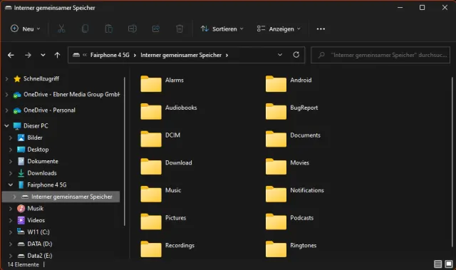 Quelle: PCtipp.chIm Datei-Explorer ist als Unterordner Ihres Smartphones jetzt z.B. Interner gemeinsamer Speicher aufgetaucht. Darin finden Sie zum Beispiel im Ordner DCIM die von Ihnen per Smartphone geknipsten Fotos und im Ordner \Pictures\Screenshots\ die von Ihnen erstellten Screenshots.