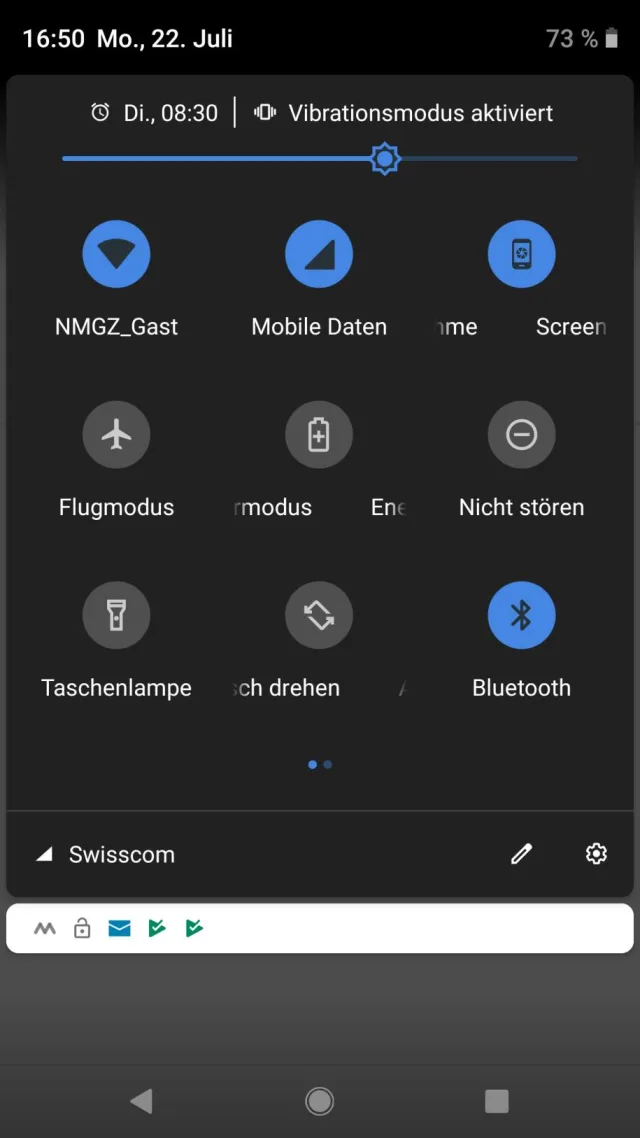 Wischen Sie vom oberen Rand herunter. Falls das Bluetooth-Symbol (das mit dem eckigen grossen B) noch nicht zu sehen ist, wischen Sie noch ein zweites Mal, um mehr Schnellzugriffs-Icons anzuzeigen. Sollte es weiterhin fehlen, lässt sich oft auch noch nach links oder rechts blättern, um die restlichen Icons zu sehen.