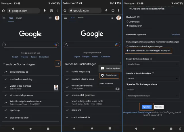 Oder tauchen «Trends bei Suchanfragen» auf? Tippen Sie dahinter aufs Drei-Punkte-Symbol, wählen Sie Einstellungen, scrollen Sie etwas herunter und schalten Sie auf Keine beliebten Suchanfragen anzeigen um. Vergessen Sie nicht, ganz unten auf Speichern zu tippen.